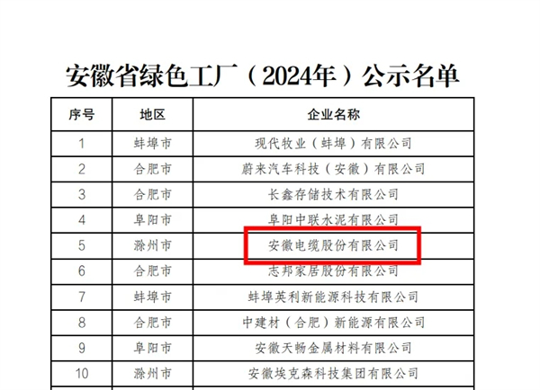 近日,安徽省工業(yè)和信息化廳發(fā)布了《安徽省綠色工廠(2024年)公示名單》,安徽電纜股份有限公司脫穎而出,成功獲評“安徽省綠色工廠”稱號。